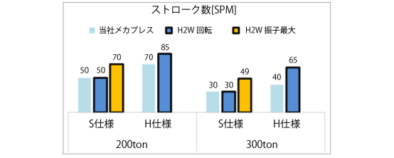 可以输出无关生产速度的高作功量(能量)。即使为了提高成形性而降低滑块速度,作功量也不会降低,因此以前机械压力机不能对应的深拉伸产品也可以冲压成型。