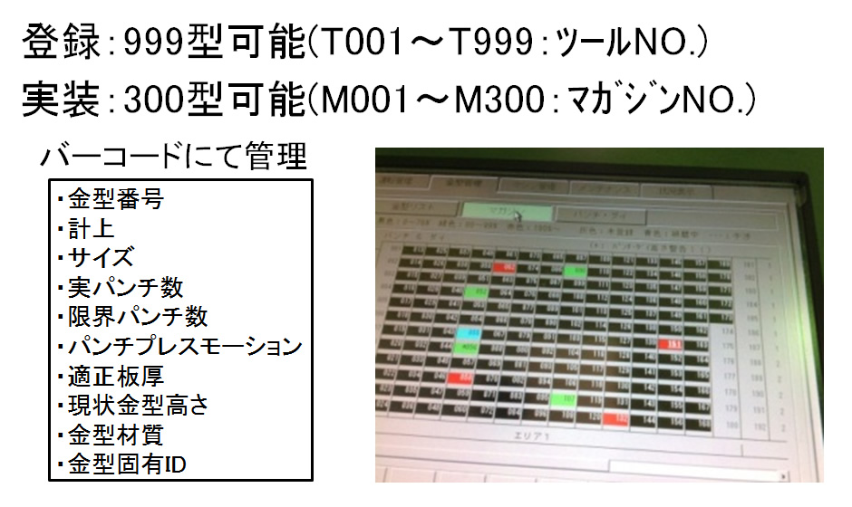 通过可存放300个模具的收纳仓、单冲压头的全自动索引,几乎无需更换模具。此外,通过模具管理功能,可以防止由于模具设定错误而造成的破损和不良品。